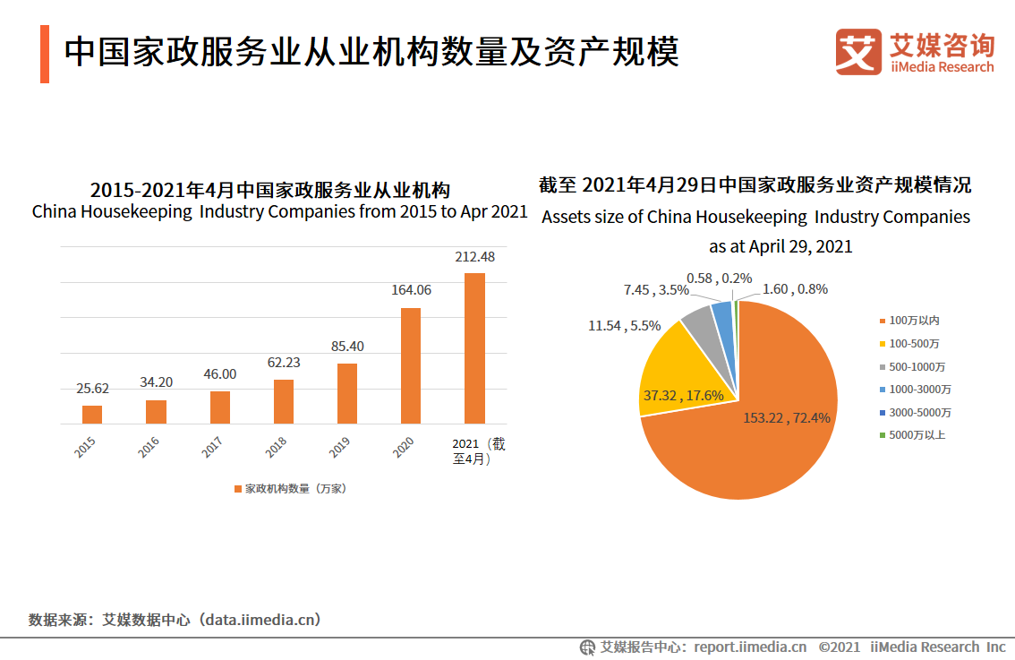 数据显示,中国目前共有超过212万家企业名称或经营范围含“家政服务”,且登记状态为在业/存续的相关企业。其中,个体工商户和有限责任公司分别占比约为55%和46%。行业分布方面,11%的相关企业分布在房地产业,40%的相关企业分布于居民服务、修理和其他服务业。同时截至 2021年4月29日,中国家政服务机构中,注册资本在100万以内有约153万家,占比约72%,注册资本在100至500万之内约有37万家,占比约18%。